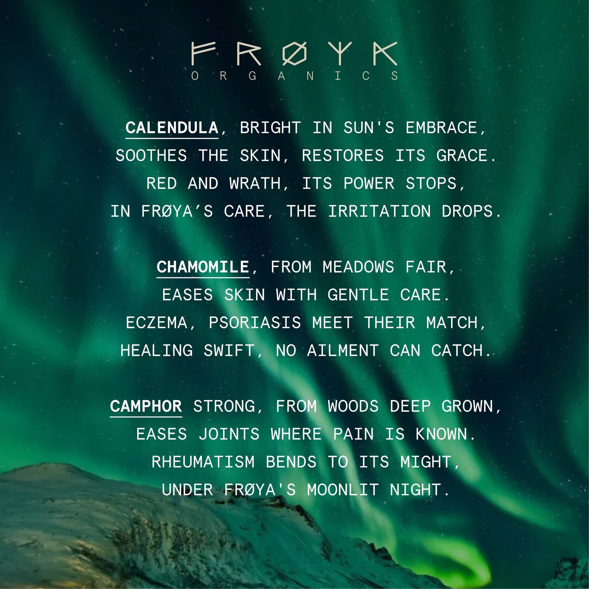 Arctic plants need to survive arctic winters. They need to protect themselves from -30 degrees. The ripening window in the Arctic is short, but during this period they get sunlight 24/7 and the plants need to get all the nutrition to the blooms fast. Making them more potent than anything else on the planet. The Frøya Organics products are filled with plants that evolved to survive in the Arctic.